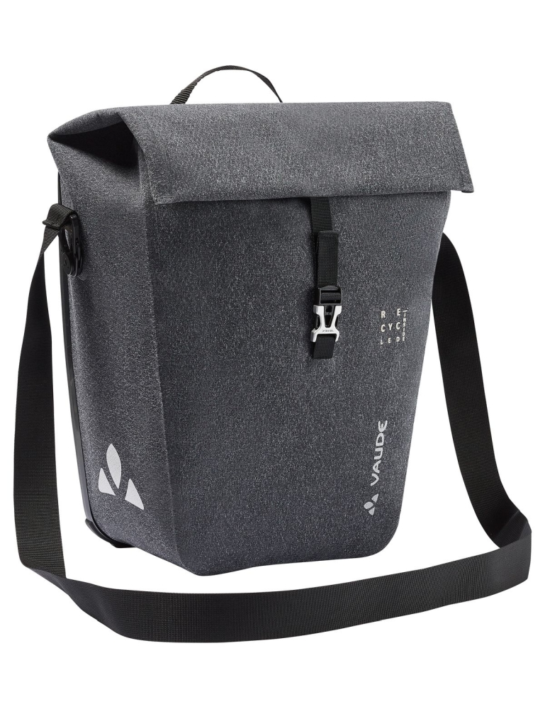 De Vaude ReCycle Pro Single enkele fietstas is voorzien van een hardback-plaat die voor 64% bestaat uit gerecycled materiaal van huishoudafval. Het robuuste, voor 100% gerecyclede tassenmateriaal met textiel-look is volledig PVC-vrij en waterdicht gelast. De stijlvolle tas is voorzien van een gemakkelijke deksel omklapsluiting, groot hoofdvak en een klein vakje met ritssluiting. De afneembare schouderband en reflecterende logo’s maken ‘m helemaal af.